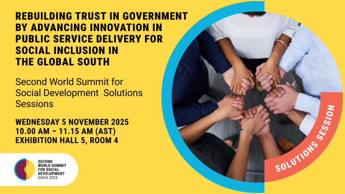 A Solutions Session on “Rebuilding Trust in Government by Advancing Innovation in Public Service Delivery for Social Inclusion in the Global South” will be organized by the United Nations Department of Economic and Social Affairs (UN DESA), through its Division for Public Institutions and Digital Government (DPIDG) and its Project Office on Governance (UNPOG), in collaboration with the Republic of Maldives and the United Nations Economic and Social Commission for Western Asia (ESCWA) within the framework of the Second World Summit for Social Development to be held in Doha, Qatar, from 4 to 6 November 2025.